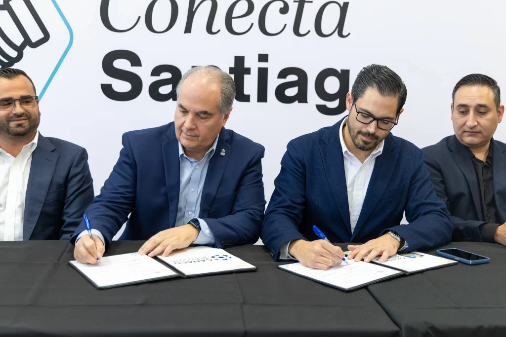 El convenio fue signado por el Lic. David de la Peña Marroquín, Alcalde de Santiago; el Lic. Jorge Eduardo Herrera Guajardo, Secretario de Desarrollo Económico del municipio; el Ing. Héctor Villarreal Muraira, Director General de CANACO Monterrey; y la Lic. Ana Esqueda, Directora de Desarrollo de Negocios de la Cámara.