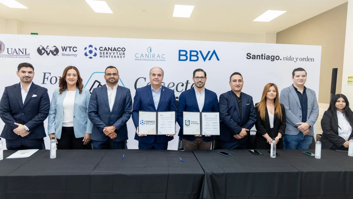 El convenio fue signado por el Lic. David de la Peña Marroquín, Alcalde de Santiago; el Lic. Jorge Eduardo Herrera Guajardo, Secretario de Desarrollo Económico del municipio; el Ing. Héctor Villarreal Muraira, Director General de CANACO Monterrey; y la Lic. Ana Esqueda, Directora de Desarrollo de Negocios de la Cámara.